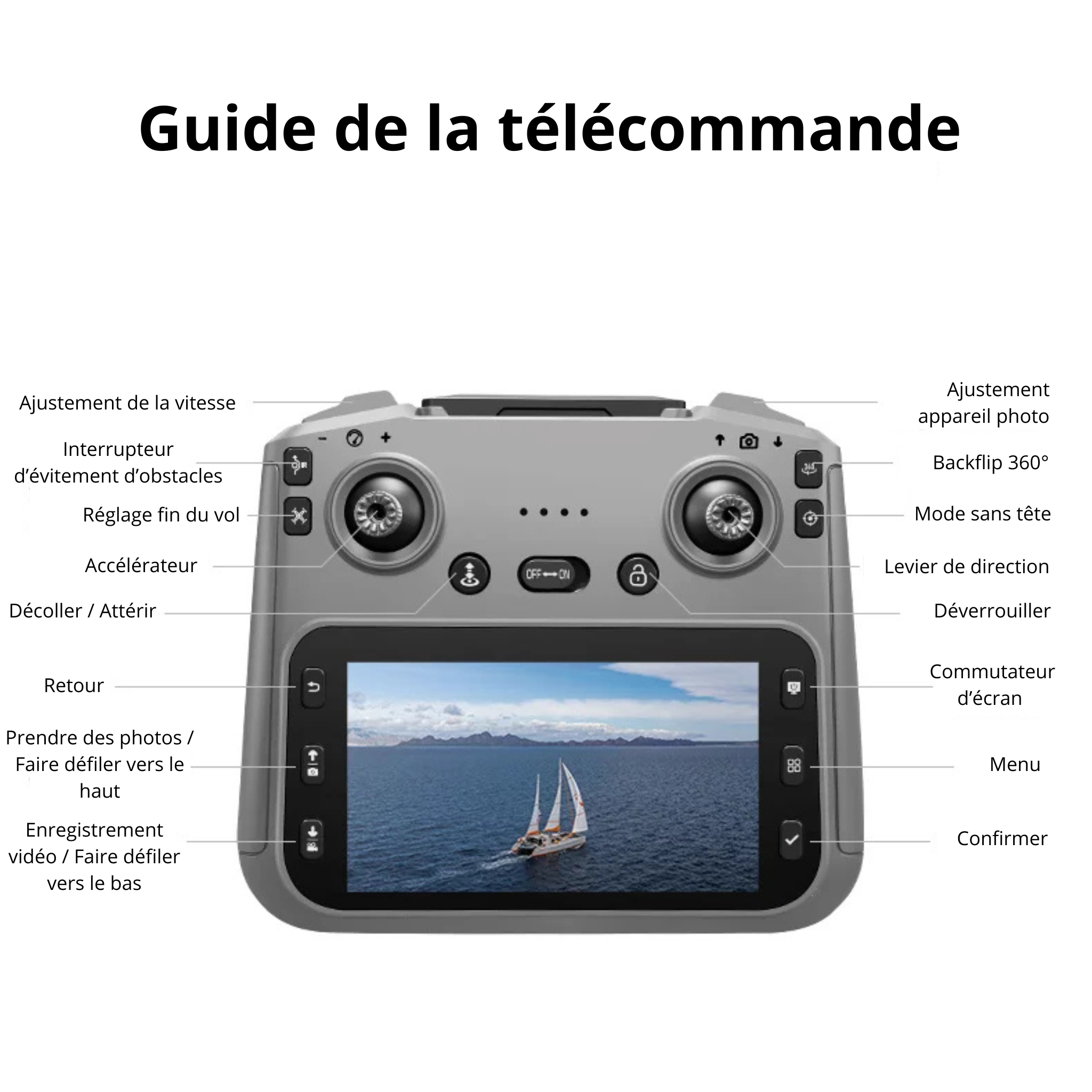 | Transmission | WiFi FPV Télécommande avec grand écran HD + App mobile |